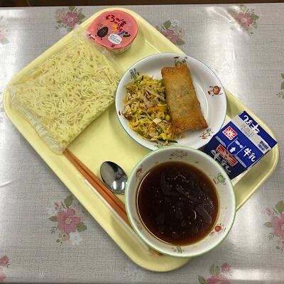 冷やし中華そば 春巻き 黒ごまプリン 牛乳