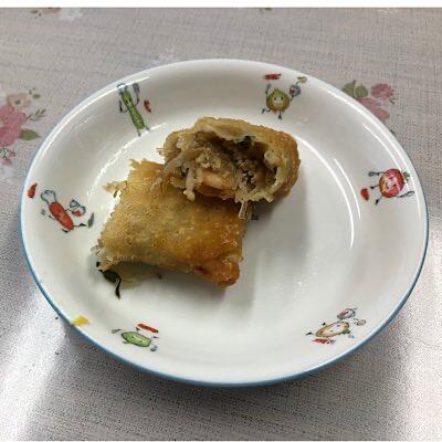 カラリと揚がった皮の中身は、豚肉、むきえび、春雨、にら、もやし