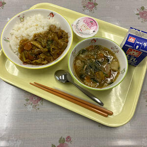 ホイコーロー、ワンタンスープ、ごはん、牛乳、杏仁豆腐