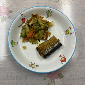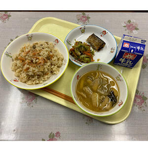 きのこごはん、さんまの塩焼き、即席漬け、みそ汁、牛乳