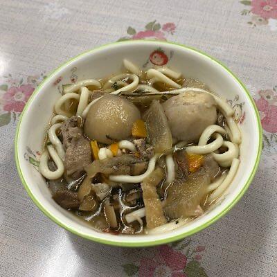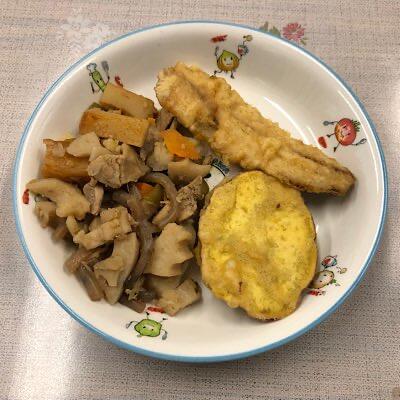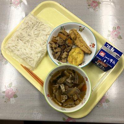 けんちんうどん 天ぷら(いわし、さつまいも)れんこんの生姜煮 牛乳