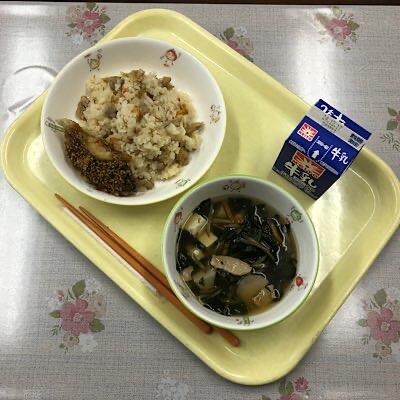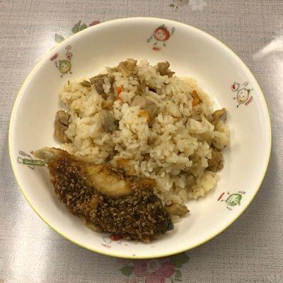 とりごぼうごはん 白身魚のごまからめ 沢煮椀 牛乳