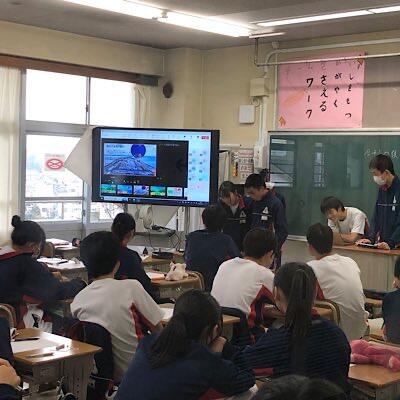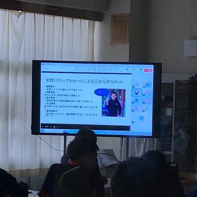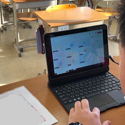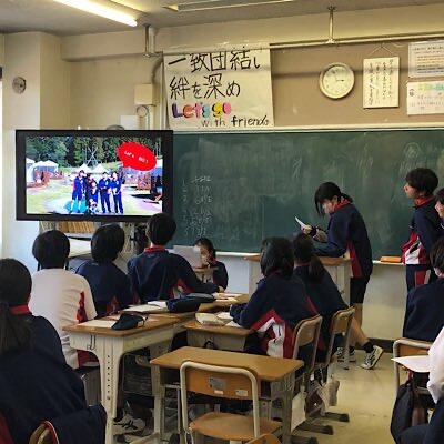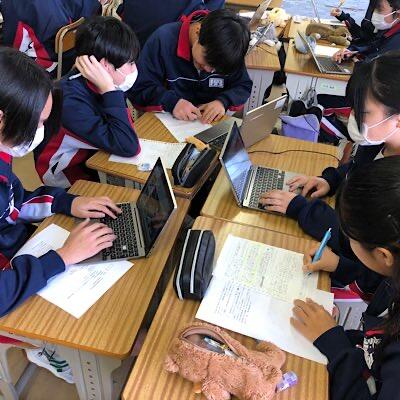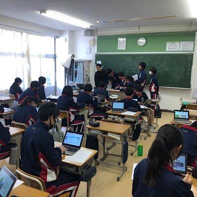 学年teams(オンライン会議)で学級代表グループのプレゼンを各教室で共有中