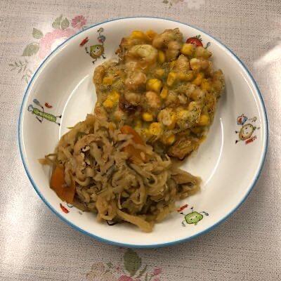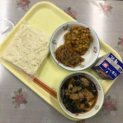 きつねうどん 大豆のかき揚げ 切り干し大根 牛乳