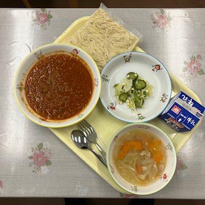 スパゲッティミートソース イタリアンサラダ ABCスープ 牛乳