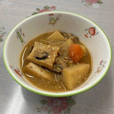 豚ひき肉、厚揚げ、じゃがいも、しいたけ、さやいんげん、豊富な具材を甘めのみそ味で、煮込みました
