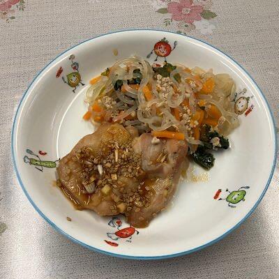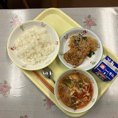 鶏肉のバーベキューソース しらたきソテー トマトスープ ごはん 牛乳