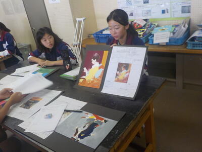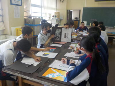 2年生の美術です。名画のオマージュ作品について仲間に説明をしています。