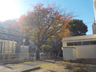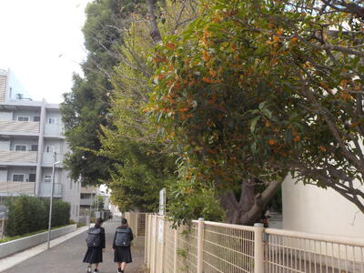 学校の裏門前の道や敷地内の落ち葉を拾っていきます。