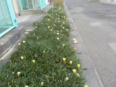 正門前の花壇にパンジーやナデシコ、アリッサムを植えてくれました。