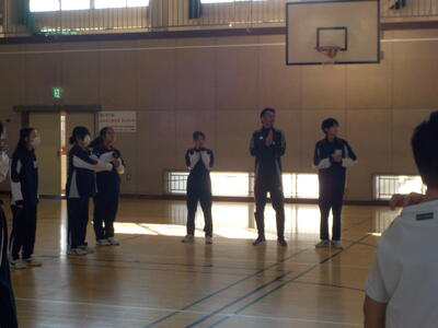 授業参観の後は、体育館で生徒会が中学校生活について説明しました。キラキラ