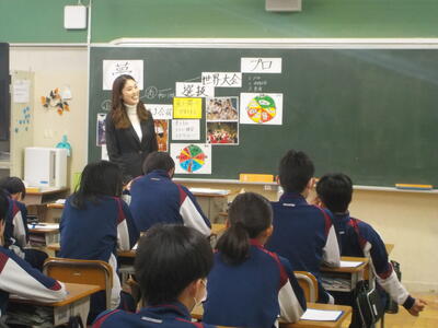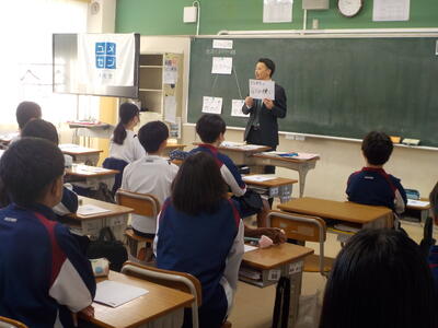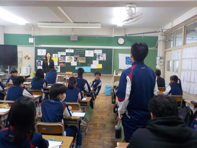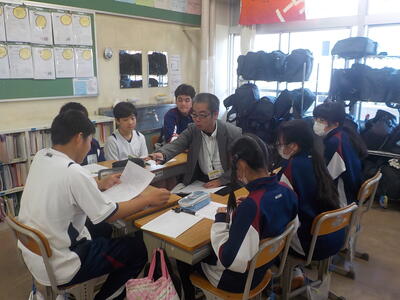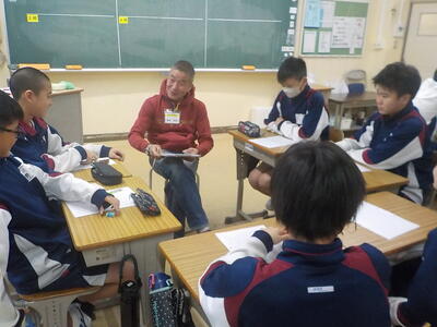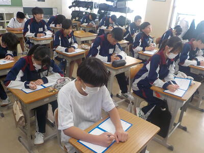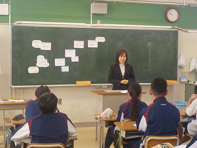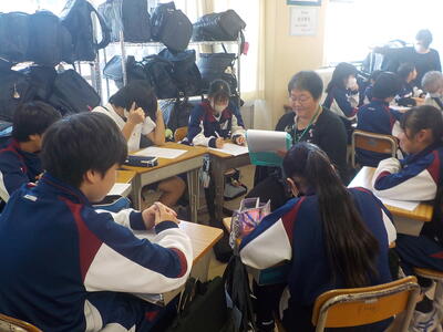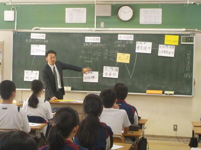 六中生が落ち着いて授業を受けている様子に感心していました。また、教室内の掲示物が明るくて、写真が多く使われていることにお褒めの言葉をいただきました。キラキラ