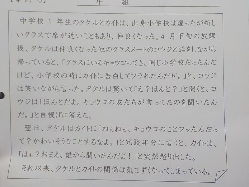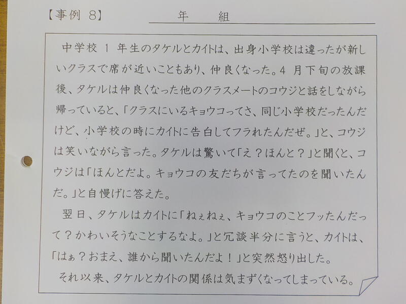 いじめをテーマに生徒から意見を引き出してもらいました。笑う