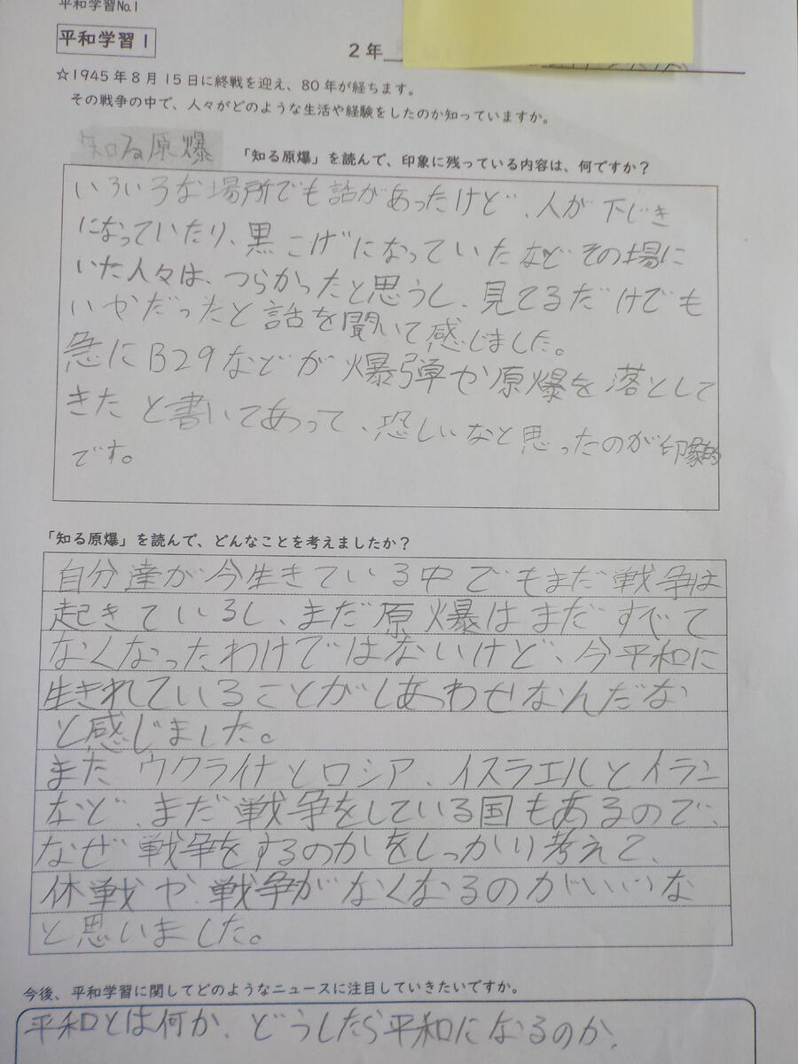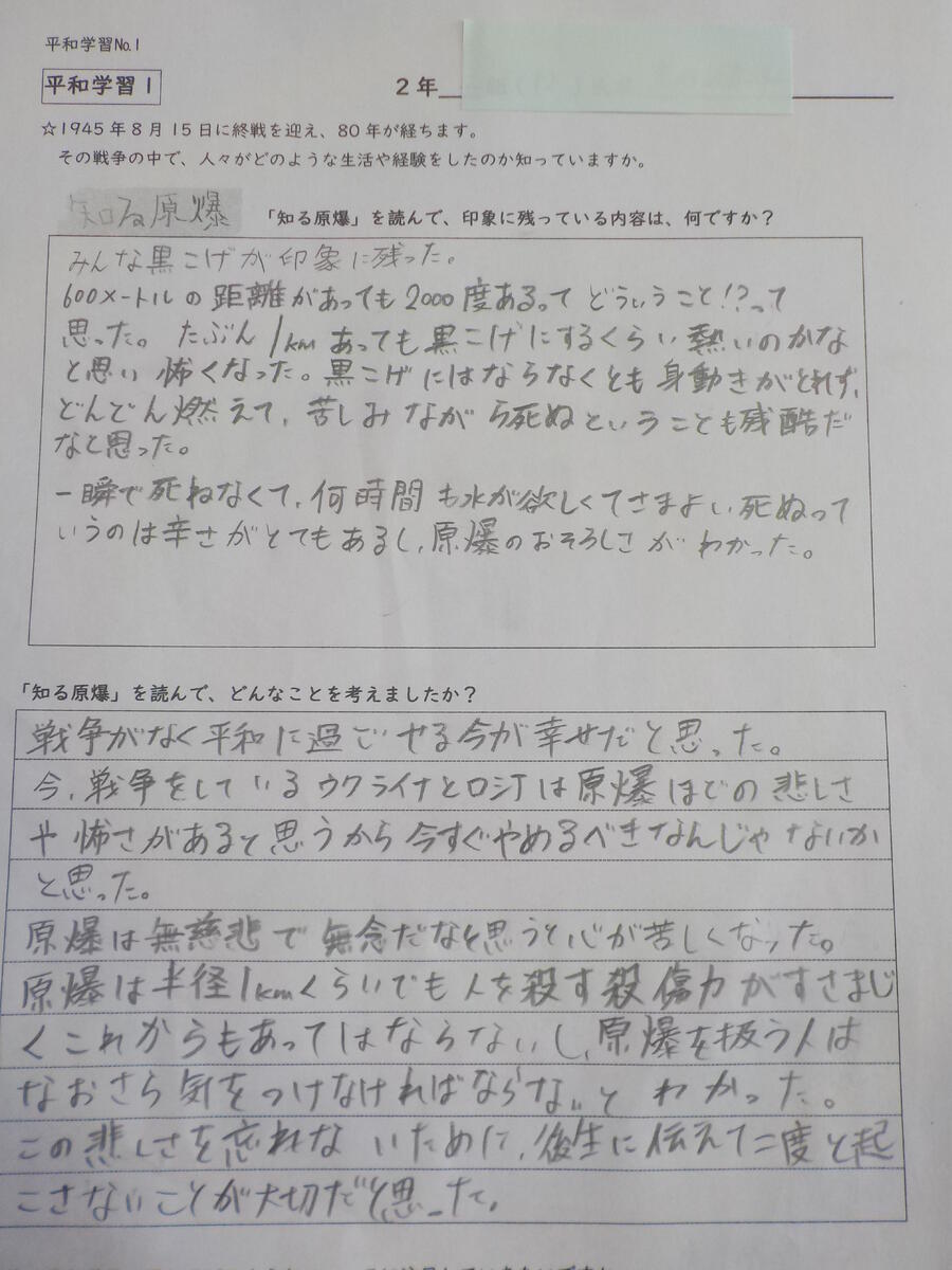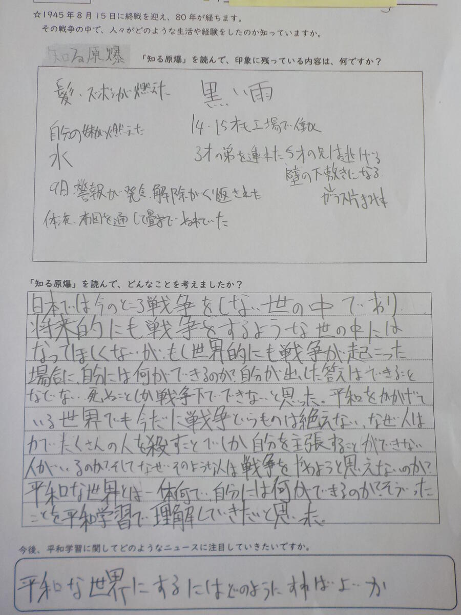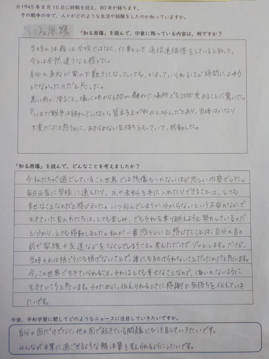 生徒の感想です。原爆の悲惨さが、心に深く刻まれたようです。