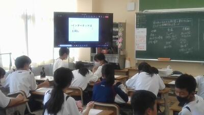 講師に市川市少年センターの職員をお招きし、1組は対面で、2~6組はオンライン形式でインターネットを介したトラブルや危険について講師の方の説明を聞いたり、講師の質問に生徒同士で対話したりしながら学習しました。