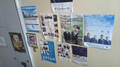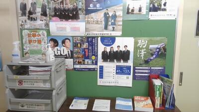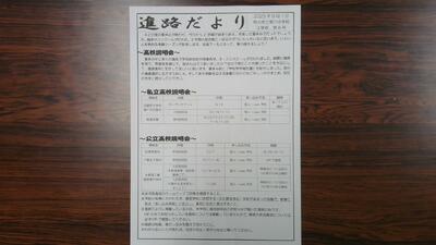 3学年の各教室や廊下の進路コーナーには、進路情報誌や問題集などが置かれてあり、自由に見ることができます。また、学年職員が「進路だより」を随時作成し、高校の説明会や一日体験入学、文化祭の日程一覧等最新の情報を紹介しています。