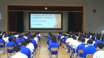 集会では、進路決定に向けての心構え、今後の進路決定までの流れなどについての説明があり、生徒たちは皆真剣な表情で聞いていました。