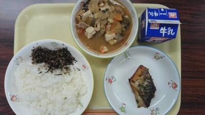 ごはん、ひじきのふりかけ、鯖のピリ辛焼き、さつま汁、牛乳でした。