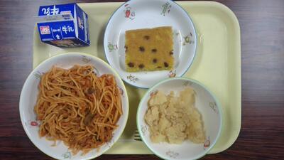ナポリタン・ツナポテト・チーズと豆のケーキ・牛乳でした。