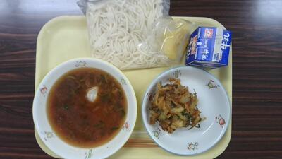 梅香冷やしうどん、かみかみかき揚げ、冷凍りんご、牛乳でした。