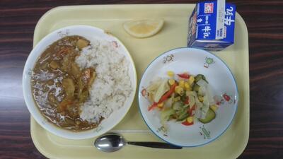 麦ごはん・春の野菜カレー・コーンサラダ・こなつ(柑橘類)・牛乳でした。カレーは、定番のジャガイモ・玉ねぎ・人参に加え、「春野菜」のキャベツ・たけのこ、アスパラガスが入っていました。