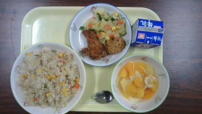 ツナピラフ、フライドチキン、マセドアンサラダ、フルーツポンチ、牛乳でした。