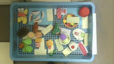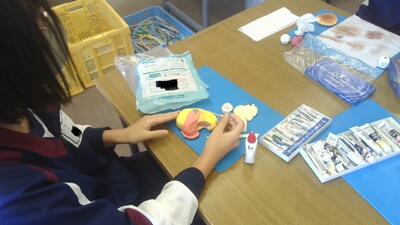 1年生は「食品サンプル」を製作しています。紙粘土に着色し、ケーキや和菓子、ハンバーグなど自分の好きな食品を制作していきます。色合いや細かな表現が難しいところもありますが、生徒たちは見事に表現し、本物に見間違うほどの作品が次々と作成されています。