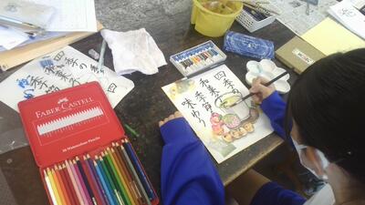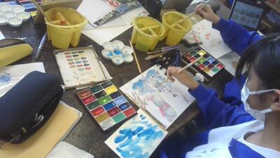 3年生は「色紙づくり」に取り組んでいます。自分の好きなものや伝えたいことを水彩や顔彩を使って作ります。現在下書きから本番へといった段階の生徒が多いですが、それぞれの感性が光る素晴らしい作品が作られています。