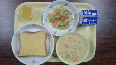 ハニートースト、米粉のシチュー、フレンチサラダ、オレンジゼリー、牛乳でした。