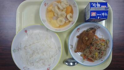 ごはん、いなだの和風ソース、白滝ソテー、フルーツポンチ、牛乳でした。