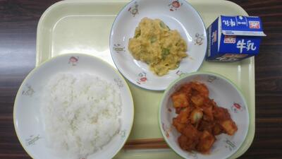 ごはん、タラとジャガイモのチリソース、カボチャサラダ、牛乳でした。