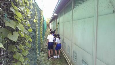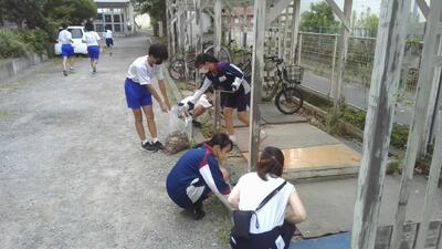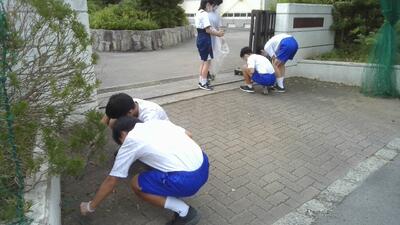 生徒会の呼びかけにより参加してくれた生徒が、正門周辺、裏門周辺、体育倉庫周辺の3か所に分かれ、草むしりや落ちているごみなどを拾いました。