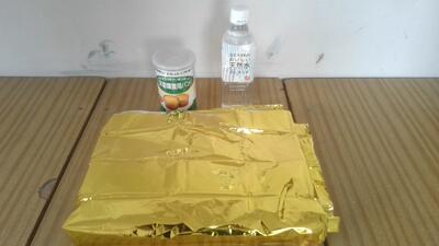 本校では、大きな地震や水害などが発生し、生徒の帰宅が困難な場合などがあった時に備えて、PTAが缶入りのパン(1食分)、ペットボトルの水(500ml)、ハイブリッドシートを生徒数分購入してくれています。