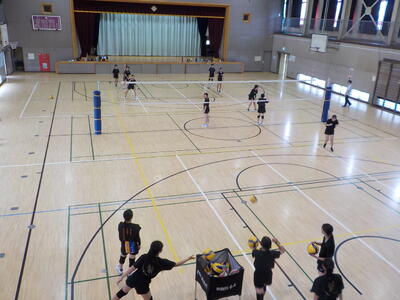 女子バレー部は、30人近い部員が意欲的に活動しています。プレーだけでなく礼儀や態度も素晴らしいチームです。(脱いだ靴を見ればわかります)