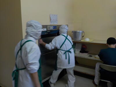 六中の給食は大和田小で作られて運ばれてきます。配膳員さんがコンテナを受け取り、ワゴンに乗せ換えて各階の配膳室に準備してくれます。