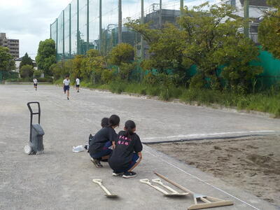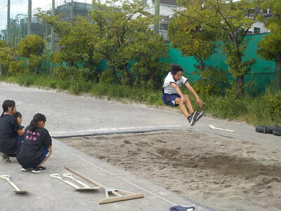 陸上部は生徒の自主性を重んじながら活動しています。この日は走り幅跳びに取り組んでいました。