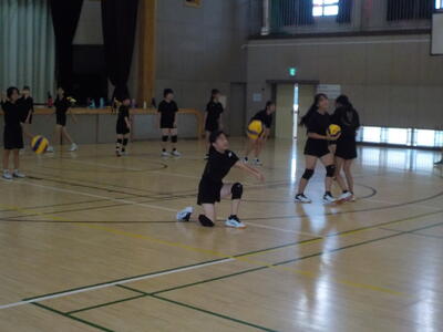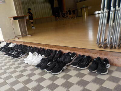 女子バレー部は、30人近い部員が意欲的に活動しています。プレーだけでなく礼儀や態度も素晴らしいチームです。(脱いだ靴を見ればわかります)