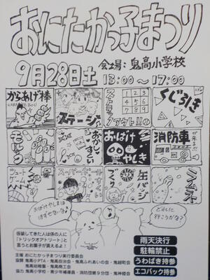 明日(9/28)、鬼高小学校にておにたかっ子まつりが開催されます。六中から約20名の生徒がボランティア活動をします。天気が心配ですが、楽しみですね。