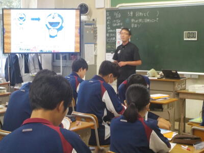 3年英語の授業です。絵を見ながら会話をしています。↑↓