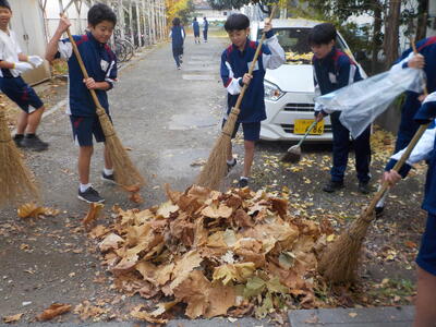 道や校内の落ち葉を拾っていきます。みんなとても積極的に取り組んでくれました。