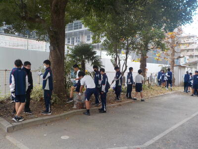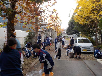 予告していた落ち葉拾いボランティアが行われました。なんと60名を超える生徒が参加してくれました。