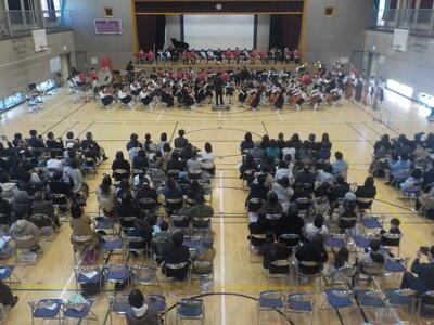 鬼高小管弦楽部と稲荷木小吹奏楽部と一緒に、音楽会を体育館で行いました。