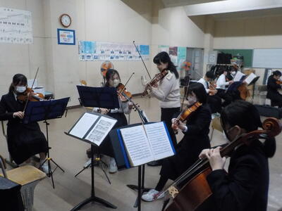 明日の午前中、六中体育館で音楽会があり、管弦楽部が演奏します。