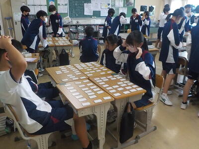 ちはやぶる~(百人一首) 投稿日時 : 2024/07/02 第六中学校管理者 1年生の教室から、百人一首のよみ上げの音声が聞こえてきます。 手を頭にのせて、お手付きをしないように。 「ちはやぶる~」の下の句は「からくれないに 水くくるとは」 ですね。
