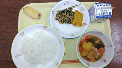 牛乳 ご飯 揚げとじゃが芋のそぼろ煮 焼きししゃも ごま酢和え りんご