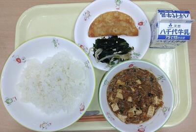 牛乳 ご飯 麻婆豆腐 ナムル 餃子のアップルパイ