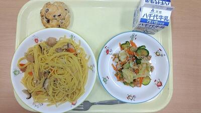 牛乳 きのこスパゲッティー 焼肉サラダ チョコチップスコーン