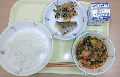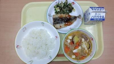 牛乳 ご飯 鰯のかば焼き さつま汁 おひたし