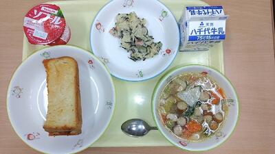 牛乳 はちみつレモントースト チリコンカン ひじきのマリネ ヨーグルト