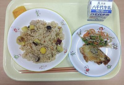 牛乳 吹き寄せご飯 鯖の立田揚げ ごま和え 柿